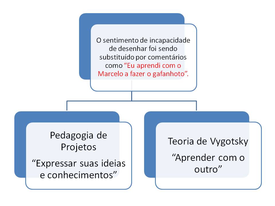 Neste trecho segundo Vygotsky a criança aprende com outra criança e este aprendizado se enraíza em seus pensamentos e no agir posteriormente, ou seja, a menina será capaz de desenhar um gafanhoto sozinha, logo que aprendeu com o amigo, salientando ainda que o educando teve a oportunidade de expressar suas ideias, conhecimentos e questões sobre o tema escolhido em grupo.