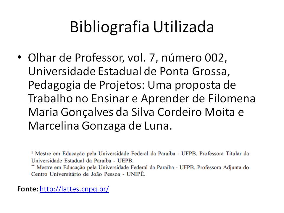 1. Bibliografia: Olhar de Professor, vol. 7, número 002, Universidade Estadual de Ponta Grossa, Pedagogia de Projetos: Uma proposta de Trabalho no Ensinar e Aprender de Filomena Maria Gonçalves da Silva Cordeiro Moita e Marcelina Gonzaga de Luna.